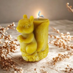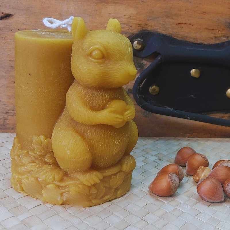 Découvrez cette bougie en cire d'abeille naturelle, représentant un écurieul gourmant tenant précieux butin une noisette