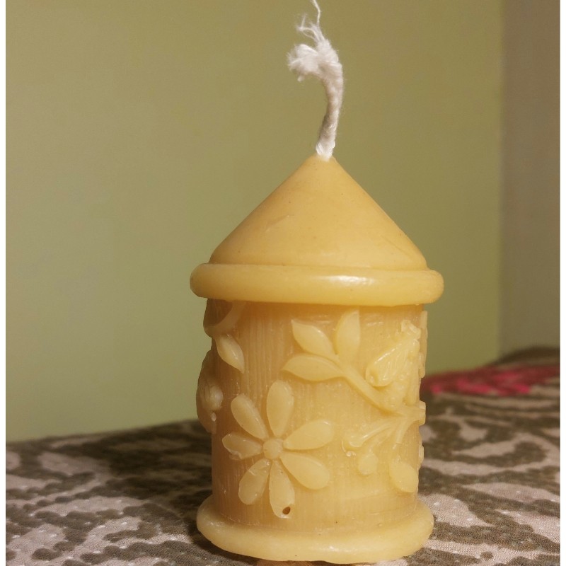 Découvrez cette bougie en cire d'abeille naturelle, ruche ronde fleurie.