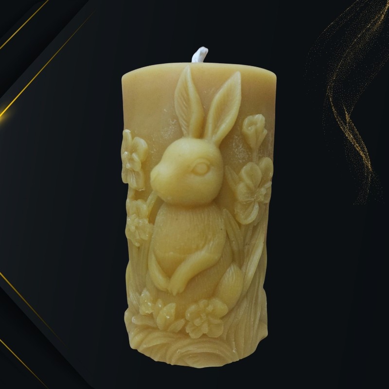 Découvrez cette bougie en cire d'abeille naturelle, représentant un lapin dans la prairie.